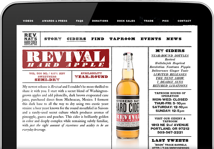 We built a flexible site that keeps pace with this growing company. As Nat changes his offerings, he can add, remove, and update ciders with a just a few clicks. Our custom code takes keeps everything looking tasty. In every detail, Reverend Nat’s new site exposes what makes his company compelling. We’re just as obsessed with the web as Reverend Nat is with cidermaking. The result is an intoxicating user experience.